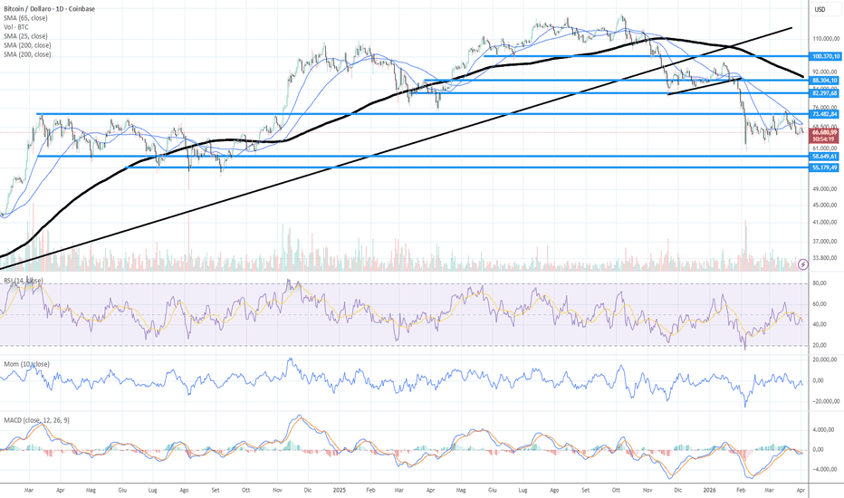 BTC ancora non ha trovato il minimo relativo?Il grafico mostra una situazione tecnica ancora debole fino a che non verra' superato il livello di 73k. Una violazione di area 60 ha come potenziale obiettivo le 2 linee orizzontali a 58 e 55k circa, dove non si esclude una potenziale divergenza rialzista per un sostanzioso rimbalzo. Indicatori ed