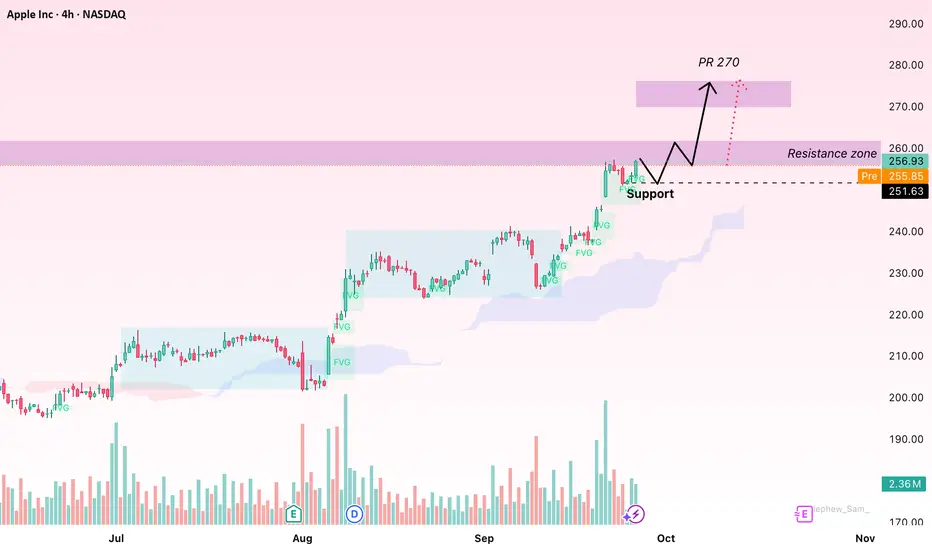 Apple Inc. (AAPL) is currently trading around $256.93, up 1.35% in the latest session. Following a strong rally, AAPL remains supported by both technical signals and macro factors. On the technical side, $257 is acting as a key resistance; a breakout above this level could open the way toward $260 and even $270. Meanwhile, the $250 zone continues to serve as strong support, providing a solid base for the uptrend. Ichimoku Cloud shows AAPL holding above the Kumo, reinforcing the bullish outlook, while Fair Value Gaps (FVG) from previous price action also offer potential support areas during pullbacks. Trading volume has increased notably, reflecting positive inflows into the stock.