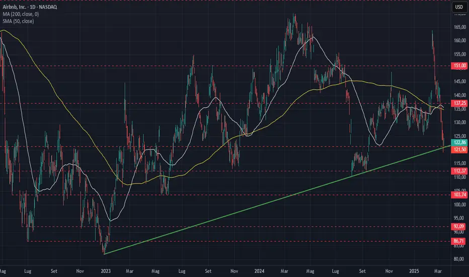 Il prezzo del titolo Airbnb chiude la settimana recuperando l'area di supporto statica dei 121,50 $ e la trendline rialzista che transita in area 121 $.