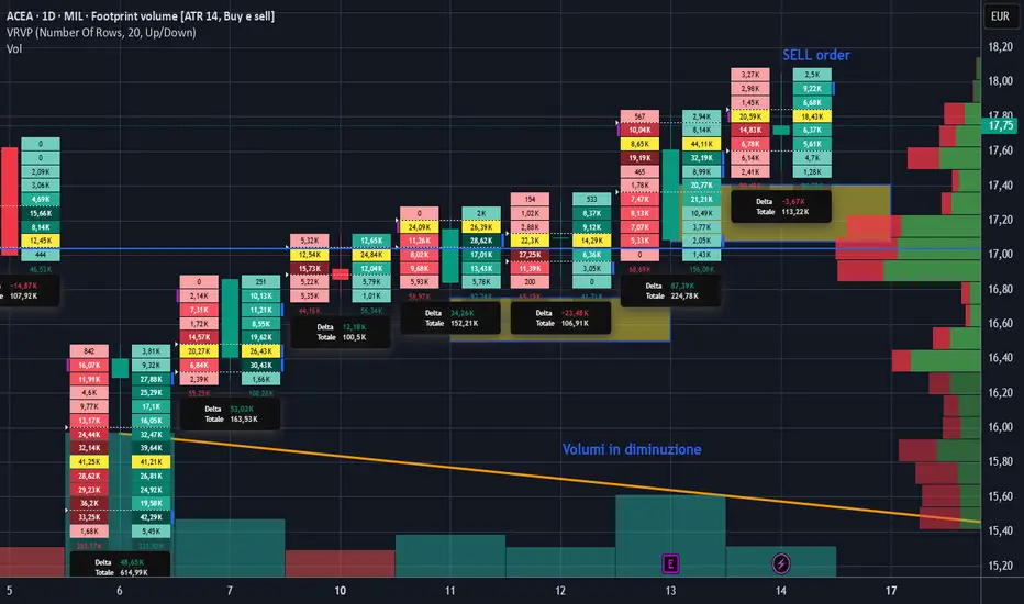 Valori di volume in diminuzione e delta negativo ultima candela rialzista; fa presagire un possibile ribasso.