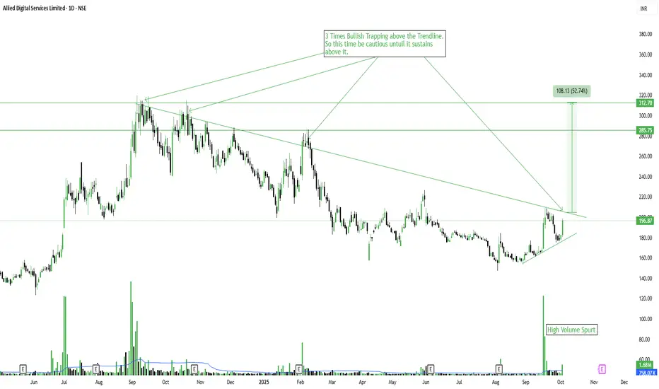 Allied Digital Services is testing its long-term descending trendline once again — a level that has trapped bulls three times before. Each of those attempts failed to sustain, leading to sharp pullbacks.