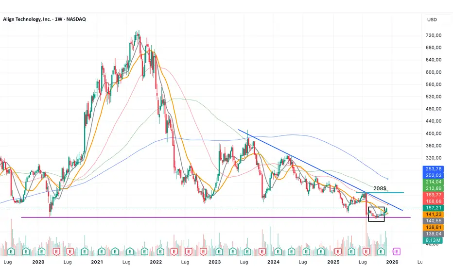 Evidente compressione con test del precedente minimo, il prezzo si dirige ora verso la resistenza blu in zona 170$ per poi proseguire ai 208$ in caso di rottura
