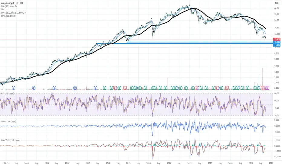 Il titolo AMP sembra continuare la sua discesa verso la fascia di supporto 12,60-12,00. Indicatori ed oscillatori impostati negativamente.