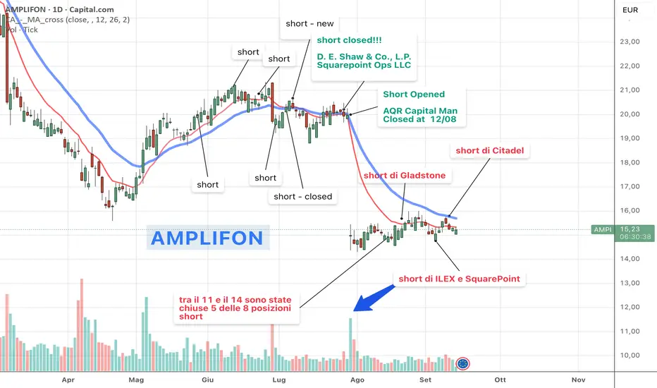 AMPLIFON: si riaprono le porte degli short agli istituzionali su prezzi intorno a 15 euro. Nonostante il recente ribasso che aveva convinto i precedenti ribassisti a prendere profitto, nuovi istituzionali ci riprovano. L'obiettivo è sicuramente andare su altri minimi di periodo sotto 14 euro.