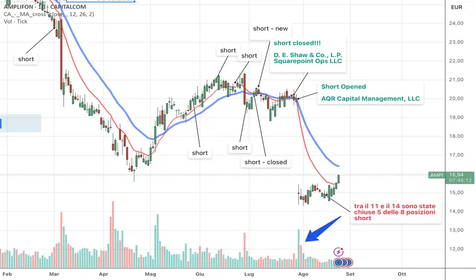 AMPLIFON: è uno dei titoli che ho seguito su tradingview per via delle numerose posizioni short degli istituzionali. Ad oggi rimangono 3 short degli 8 che avevo tracciato. 5 posizioni short sono state chiuse tra l'11 e il 14 Agosto.