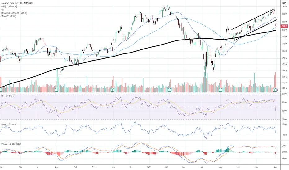 Violazione con volumi del canale ascendente e senza nuovi massimi come aveva fatto l'indice nelle scorse settimane. La violazione della 200 dara' impulso ad altre vendite estive confermate da indicatori ed oscillatori negativi.