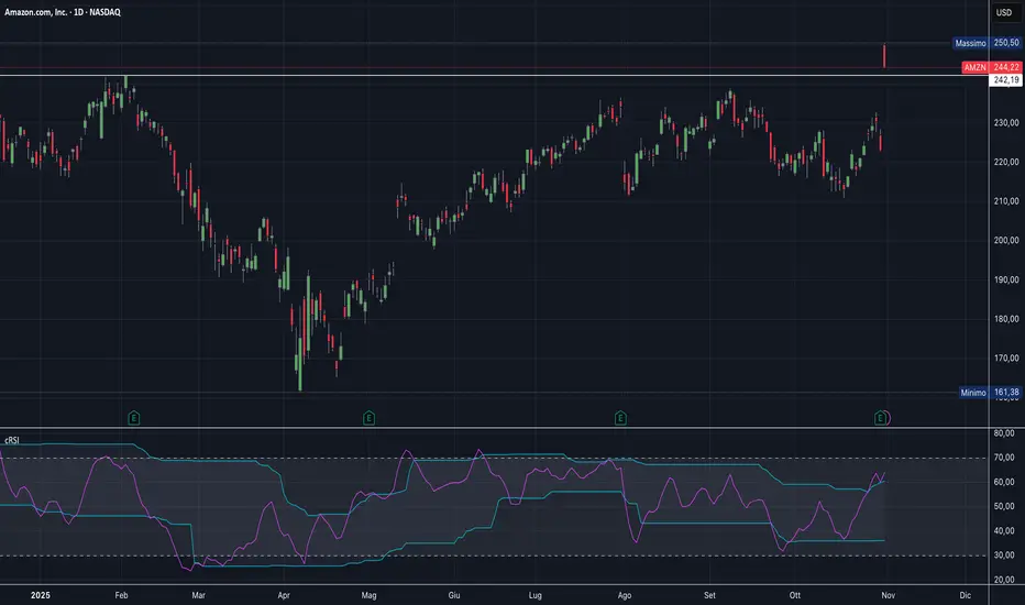 Tuttavia, è importante porre l’attenzione sulla candela giornaliera di venerdì, che mostra alcuni segnali di prudenza: apertura a 250$ e chiusura a 244$, generando quindi una candela rossa. Questo indica che, nonostante il forte exploit al rilascio della trimestrale, durante la giornata i venditori hanno preso il sopravvento.