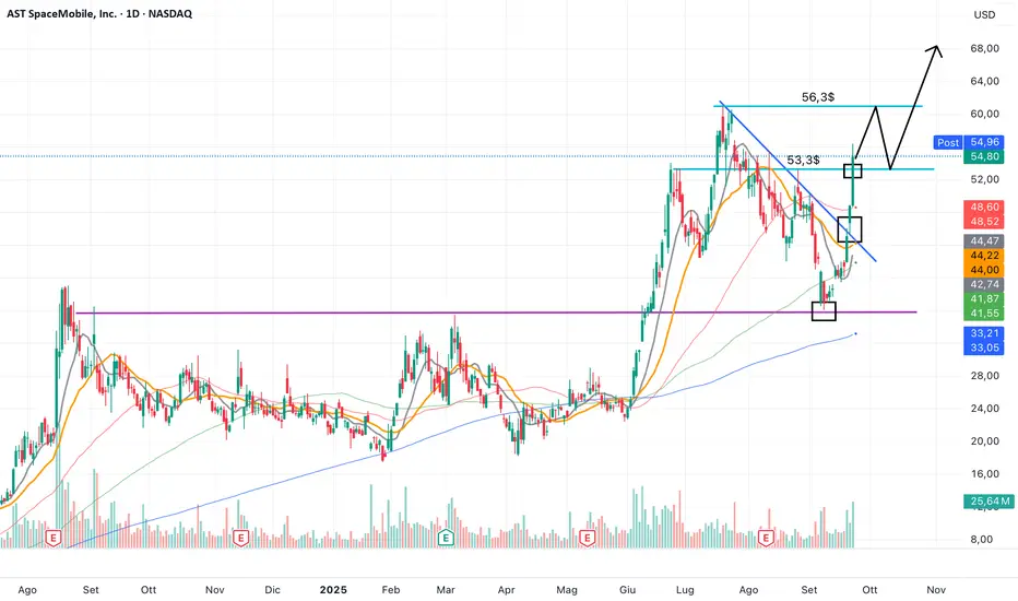Ieri il breakout della trendline blu e oggi la conferma rialzista con chiusura sopra i 53,3$