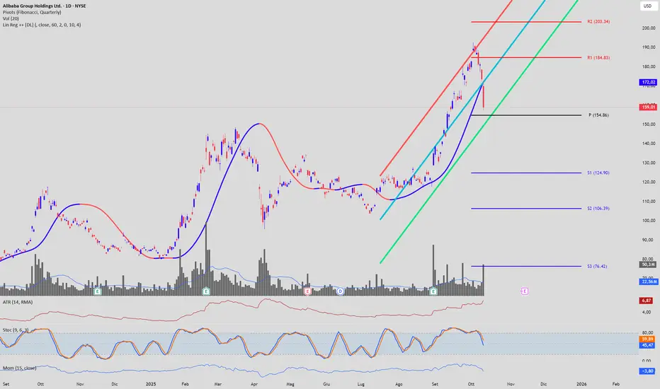 Il titolo ha recentemente manifestato una fase di spiccata tendenza rialzista, come chiaramente evidenziato dal canale di regressione lineare ascendente tracciato a partire dai minimi di agosto. Tale canale, delimitato da due deviazioni standard, ha contenuto efficacemente la progressione dei prezzi, indicando un trend di medio periodo strutturalmente positivo. Tuttavia, l'osservazione delle ultime sedute rivela un'inversione di rotta di breve termine tanto brusca quanto significativa. Il prezzo ha subito un netto rigetto in prossimità della prima resistenza calcolata con i pivot di Fibonacci, posta a $184.83, innescando una rapida discesa causata dopo il post di Trumo. Questa correzione è stata caratterizzata da una candela giornaliera ad ampio range e con una chiusura marcatamente negativa, la cui validità è corroborata da un volume di scambi nettamente superiore alla media delle sessioni precedenti. Tale combinazione di prezzo e volume conferma la forza della pressione di vendita in atto. Attualmente, il prezzo sta testando il primo livello di supporto critico, coincidente con il pivot point principale (P) a quota $154.86. La tenuta o la rottura di tale livello appare determinante per l'evoluzione nel breve periodo. Dal punto di vista degli oscillatori, lo stocastico (9,6,3) fornisce un'indicazione ribassista; dopo aver stazionato in area di ipercomprato (sopra il livello 80), ha generato un segnale di vendita attraverso l'incrocio al ribasso della sua linea veloce (%K) sulla linea lenta (%D), segnalando una perdita di momentum rialzista. Parallelamente, l'indicatore SuperTrend ha virato al rosso, fornendo un'ulteriore conferma del deterioramento del quadro tecnico di brevissimo termine. L'indicatore di volatilità, l'Average True Range (ATR), si attesta su valori elevati, indicando un aumento dell'ampiezza media delle oscillazioni di prezzo e, di conseguenza, un incremento del rischio associato all'operatività. In tale contesto, le strategie operative devono essere attentamente ponderate. Per un posizionamento di tipo "long" (rialzista), sarebbe prudente attendere un segnale di stabilizzazione dei prezzi e una chiara difesa del supporto a $154.86, idealmente confermata da una riduzione dei volumi in vendita e da una successiva candela di inversione rialzista. Un ingresso più conservativo potrebbe essere valutato solo al superamento della linea di regressione lineare a 20 periodi, che ha agito da supporto dinamico durante tutta la salita e che ora funge da resistenza. Qualora la correzione dovesse proseguire, un successivo livello di potenziale acquisto si colloca in prossimità della banda inferiore del canale di regressione principale o, in un'ottica più ampia, in corrispondenza del primo supporto Fibonacci (S1) a $124.90. Per quanto concerne le posizioni "short" (ribassiste), il segnale d'ingresso è già stato generato dalla rottura della precedente linea di tendenza e confermato dagli oscillatori. Una violazione decisa e confermata in chiusura del pivot point a $154.86 aprirebbe ulteriori spazi di discesa, con un primo obiettivo identificabile nel già citato supporto S1 a $124.90. Qualsiasi tentativo di rimbalzo tecnico che dovesse arrestarsi al di sotto della linea di regressione, ora resistenza, potrebbe essere interpretato come una nuova opportunità per aprire o incrementare posizioni ribassiste, utilizzando tale livello come riferimento per la gestione del rischio. Si raccomanda agli investitori di monitorare con attenzione l'interazione del prezzo con i livelli chiave menzionati, in quanto essa fornirà indicazioni cruciali per la direzione futura del titolo.