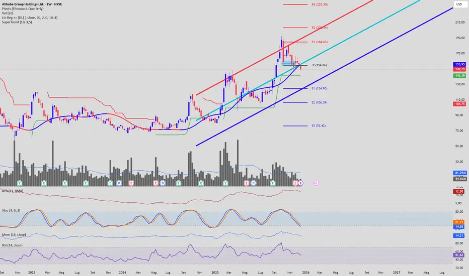 L'ultima candela settimanale mostra una chiusura a 149,79 USD, posizionandosi nella metà inferiore di questo canale e al di sotto del punto pivot centrale calcolato con il metodo Fibonacci, fissato a 154,86 USD. Questo posizionamento suggerisce una fase di potenziale debolezza all'interno del trend rialzista predominante.