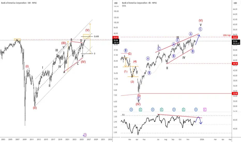 Bank of America is in an uptrend with a very strong rebound since April 2025, and the price is now approaching the 2006 highs. That area around 55 is extremely important because the current structure looks like an ending diagonal in wave five, meaning we could be in the late stages of a higher-degree bullish cycle. The push up this year also comes out of a very big triangle on the monthly chart, so despite the positive momentum, we should be aware that resistance is getting closer and bullish momentum may slow down. We also see RSI divergence on the daily chart, which is very common when diagonals mature. So while the trend is still up for now, it makes sense to be careful around 55, as a potential reversal in 2026 would not be a surprise.