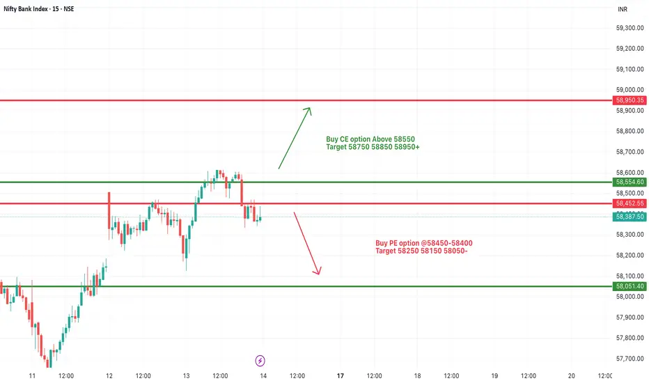 If Bank Nifty sustains above 58,450–58,500, upside momentum may build toward 58,550, 58,850, and 58,950+. A breakout above 58,550 will be the stronger confirmation for buyers, opening room for a broader upward move.
