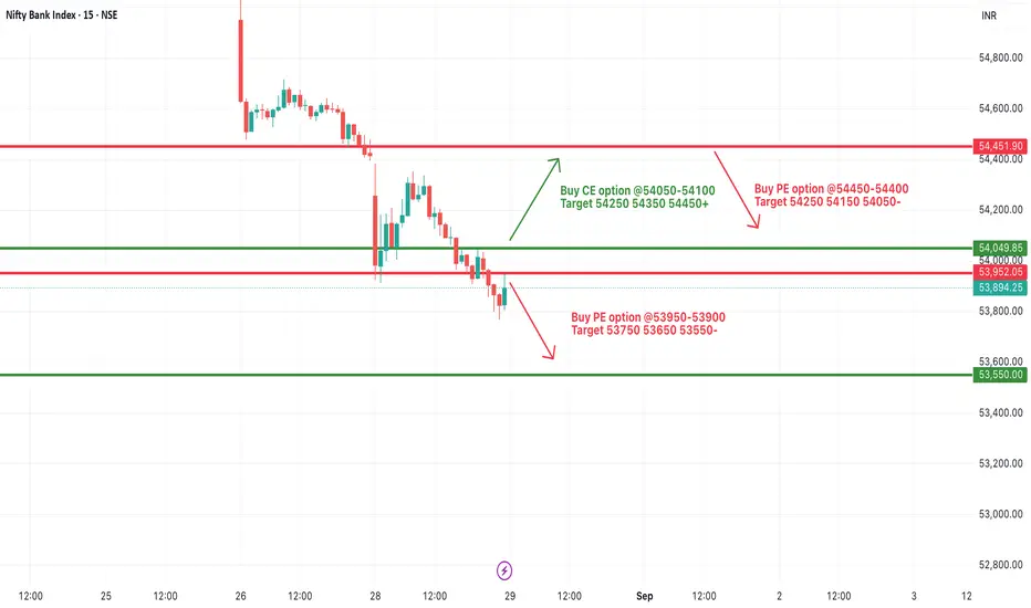 Bank Nifty is likely to witness a slightly gap-up opening today after a weak closing in the previous session. The index is currently hovering near the 53,900 zone, which is a key support area for intraday sentiment. If Bank Nifty sustains above 54,050, it may trigger a short-term correction rally, paving the way for an upside move toward 54,250, 54,350, and 54,450+. This zone will act as a crucial resistance, and only a strong breakout above it can confirm further recovery.