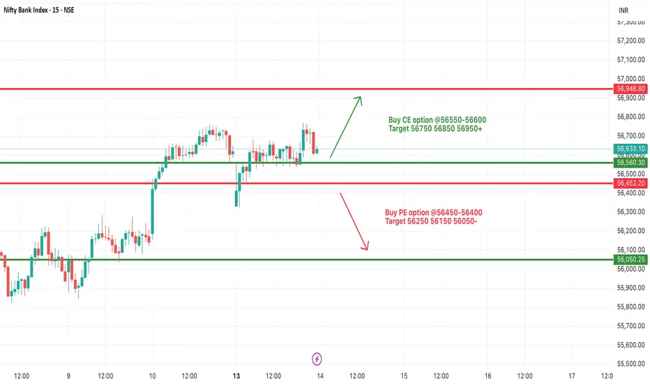 If Bank Nifty sustains above 56,550–56,600, a bullish breakout may trigger a move toward 56,750, 56,850, and 56,950+. A strong close above 56,950 will confirm a continuation of the uptrend toward 57,200+.