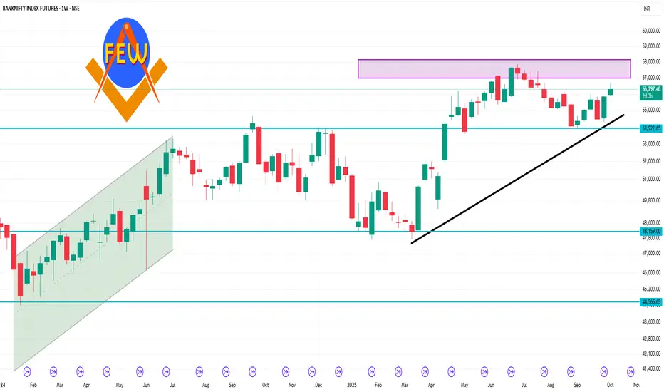 Rising Wedge Pattern: The index is forming a rising wedge, indicating potential consolidation with a chance of reversal. Immediate resistance lies around the 56,400 level, with a strong supply zone leading to potential reversal or selling pressure. A decisive breakout above 56,600 would turn bullish.