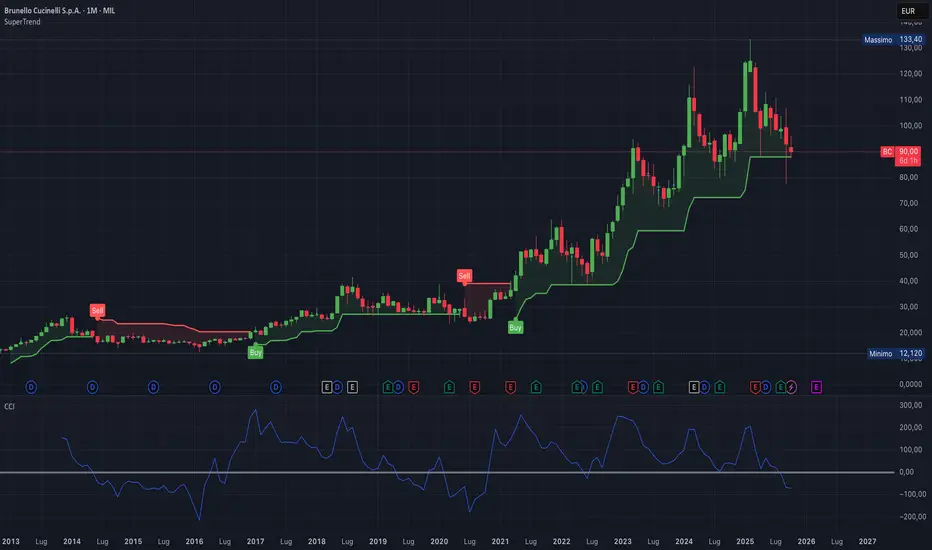 Nel grafico mensile ho voluto rendere immediatamente visibile questa dinamica utilizzando un semplice indicatore Supertrend con settaggi classici, che permette di evidenziare con chiarezza le zone chiave e la struttura del trend dominante.