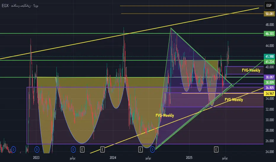 - 34.96 جنيه (دعم قوي يتقاطع مع FVG-Weekly وخط الاتجاه الصاعد)