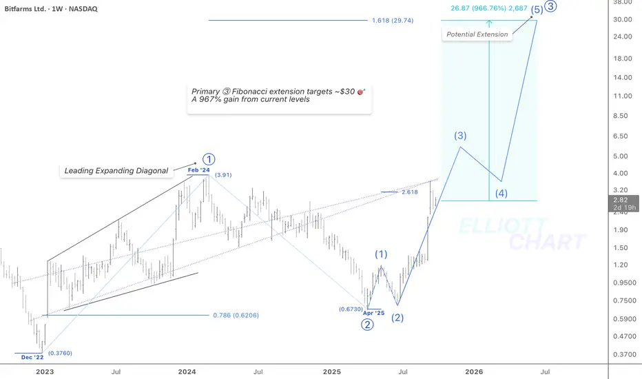Using Fibonacci extension measurements, the projected target for the completion of Primary Wave ⓷ lies near $30🎯, which would represent a 967% gain from current levels.