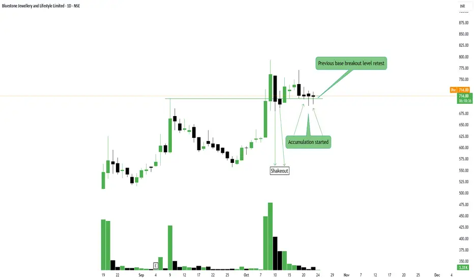 Bluestone has shown a clean breakout from its previous base structure and is now retesting that same breakout level — a healthy technical behavior before the next leg higher. After a sharp move up, the stock witnessed a controlled pullback, marked by a brief shakeout near 680, which helped remove weak hands.