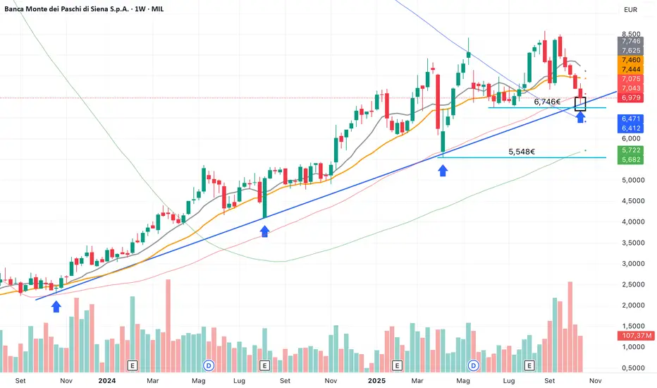 Eventuale stop sotto il minimo precedente di 6,746€ la cui rottura aprirebbe la strada verso la sma200 daily e poi il successivo supporto a 5,548€