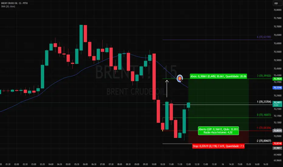 No gráfico de 5 minutos do BRENT1!, rompeu a linha branca 1 da projeção da sequência de Fibonacci para cima, retraiu para um 4/1, poderá voltar a subir até o alvo e o stop é o fechamento abaixo da linha branca -2.