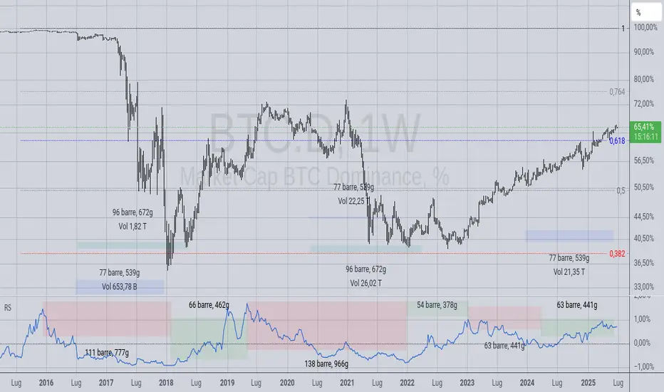 Come potete notare sul grafico, quello che è successo in questo rialzo partito verso la fine del 2022, la forza delle alts è stata molto debole rispetto a bitcoin che è stato padrone del mercato. Non so cosa succederà nel futuro, ma per vedere una bullrun sulle alts servirebbe qualcosa di mai visto e non è quello che dice attualmente il grafico.