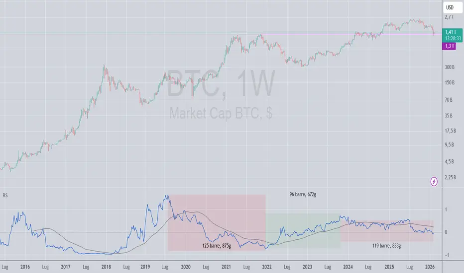 Oggi ho deciso di pubblicare questo grafico sulla capitalizzazione di Bitcoin, che già in passato mi è stato utile per capire quando il mercato era nella cosiddetta alts season o in alt party. Bene, come potete vedere l'indicatore in basso misura la forza relativa del totale sulle capitalizzazioni, di tutti gli altri progetti cripto escluse le stablecoins. Cosa mi sta dicendo questo studio? Mi sta dicendo che i progetti come eth, sol, ada, link eccetera, sono in grande sofferenza e che i capitali maggiori affluiscono prevalentemente su btc da più di tre anni. Qualcuno potrebbe dire:"Eh hai scoperto l'acqua calda!" Vero, in realtà qui ho un dato che mi fa notare una cosa elementare che tutti pensano ma nessuno dimostra, se non con indicatori costruiti dai vari market maker, come chiedere all'oste se il vino è buono in pratica. Questo grafico è utile a chi attende ancora un rialzo sulle alts, non è escluso, ma sarebbe molto debole visto che da anni il trend sta più tempo al ribasso che al rialzo, quando è andato al rialzo non è stato abbastanza potente da superare il ribasso precedente. Perciò in questo momento btc è una calamita verso la liquidità che arriva da fuori del solito giro, anzi, nemmeno perché ultimamente la liquidità passa dagli ETF anziché andare sugli exchange, cioè non vengono comprati btc "fisici" o reali, ma carta. Quindi la situazione non è per niente buona per l'intero settore, spero sia la chiusura di un ciclo di lungo periodo e l'apertura di un altro più imponente e più prospero, ma in questo momento devo dare atto a questi dati che non sono per niente buoni. Nell'indicatore di forza relativa ho applicato una media mobile a 52 periodi (un anno), giusto per dare l'idea di come la debolezza dei rialzi è evidente sotto tutti gli aspetti.