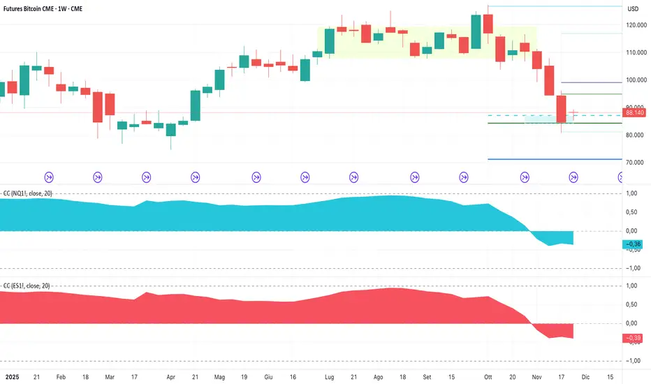 In questo scenario di ribasso di BTC si nota una decorrelazione rispetto ai mercati azionari che sono ritornati a salire. Infatti, nella parte inferiore del grafico si può vedere il coefficiente di correlazione con Nasdaq e S&P 500 che è passato ormai in negativo. Questa negatività si è registrata prima sull’S&P 500, già nella penultima settimana di ottobre, mentre sul Nasdaq si è generata solo a fine ottobre. Lo scenario mostra un eccesso di debolezza da parte di BTC, ma finché non ritornerà almeno sopra l’area dei 94.000$ , il rischio di un ulteriore calo resta elevato.