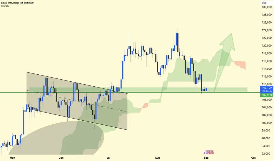 Ichimoku Cloud: Price is still inside the cloud zone, suggesting a neutral-to-bullish outlook. A strong daily close above $110K–112K could flip momentum upward.