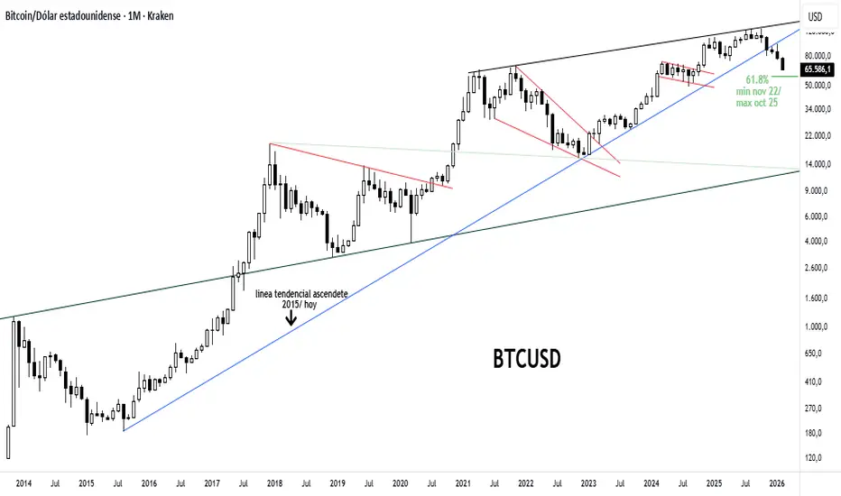 El soporte extremo apuntado hace tan solo una semana atrás para esta instancia ( ver informe adjunto ) me refiero a la zona entre 81000/84000 ptos ha sido penetrado y ello habilito un nuevo y hasta ahora incontrolable movimiento declinante, que siendo la 1.20pm horario NY lo encuentra prácticamente en el mínimo de toda la caída desde su máximo. Tal es así, que en esta oportunidad vuelvo sobre el chart de largo plazo, algo que no hacia hace ya un tiempo atrás, para mostrar de manera clara y contundente, toda la secuencia descendente, lo que en primer lugar fue impactar y respetar su resistencia de fondo y luego ir penetrando cada soporte apuntado desde entonces, destacándose fundamentalmente entre estos la linea tendencial ascendente originada en el año 2015 previo a cerrar el año 2025 y recientemente el 38.2% del ultimo movimiento ascendente entre el mínimo del año 2022 y su máximo histórico, lo cual ha significado continuar estrechando la distancia con el siguiente potencial soporte en esta nueva instancia, me refiero al 61.8% del citado movimiento alcista previo. Sin duda, los bears se han apoderado de la escena hace tiempo y aun no hay signos reales de reversión en puerta.