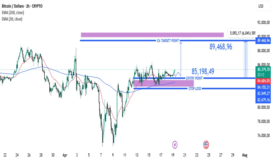 EMA 30 (rossa): 84.686,27 USD → trend di breve termine