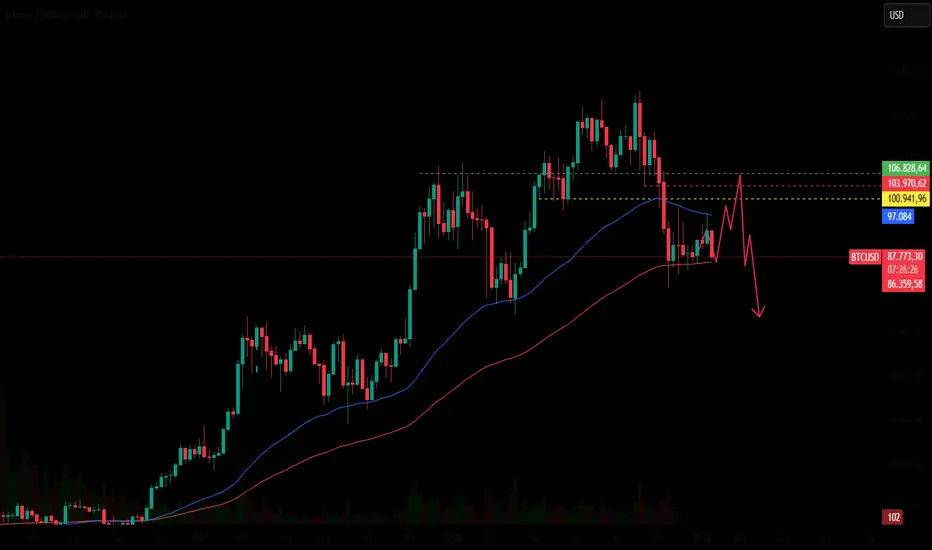 Al momento, BTC sta mantenendo saldamente la media mobile esponenziale a 1 settimana e 99 (intorno a 86.400). Tuttavia, una volta che la candela chiuderà al di sotto di tale livello, il mio prossimo obiettivo sarà la zona dei 72.000. Ho già aumentato le mie posizioni corte a 97.000 e cercherò di aumentarne altre se il mercato offrirà ingressi più alti, come potete vedere nel grafico.