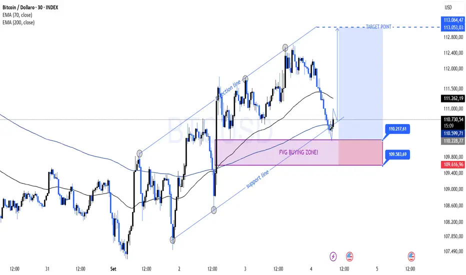 BTC si trova in un canale rialzista. Dopo il retest della zona FVG + EMA200, i compratori potrebbero spingere il prezzo verso il target $113,000 🚀📈. Una rottura sotto $109,583 invaliderebbe questo scenario rialzista.