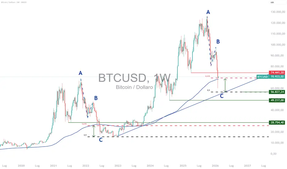 Questa area di prezzo non è stata scelta a caso e si basa su diverse importanti confluenze tecniche. In primo luogo, corrisponde a un’estensione proporzionale dell’onda C rispetto all’onda A, secondo rapporti frequentemente osservati nelle fasi di correzione ciclica di Bitcoin. Storicamente, i bear market di BTC raramente si concludono con eccessi estremi, ma piuttosto in un’area in cui la pressione di vendita si esaurisce progressivamente, lasciando spazio a una fase di stabilizzazione laterale.