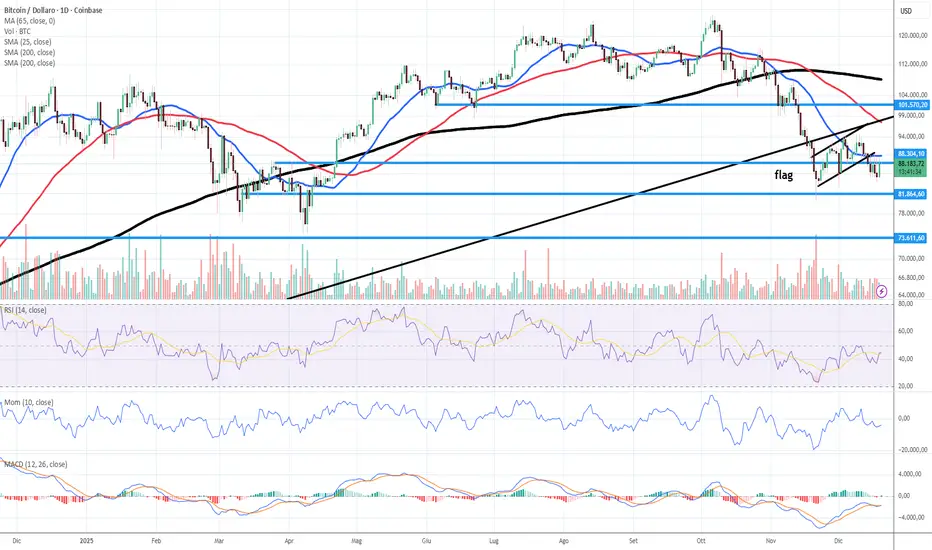 La violazione della bandiera ha riportato le quotazioni verso il basso, ma con la tenuta del primo supporto di quota 85. La violazione di questo livello e di quota 82, ha come potenziale obiettivo quota 73 (tg potenziale della bandiera) indicatori ed oscillatori ancora negativi.