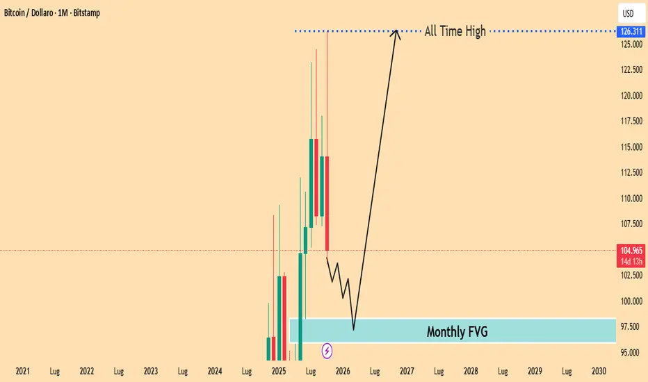 Percorso Proiettato: L'analista prevede che il prezzo scenda ulteriormente all'interno del FVG Mensile (la zona $95k - $98k) prima di trovare un forte supporto. Dopo questo test, è proiettato un importante rally rialzista che spingerà il prezzo di nuovo verso il Massimo Storico vicino a $126,311.