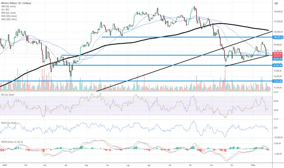 Continua la debolezza del BTc che si e riportato sulla trend di breve. Indicatori ed oscillatori impostati negativamente. In caso di violazione della trend possibili obiettivi a quota 82-80 prima e 73-70 poi.