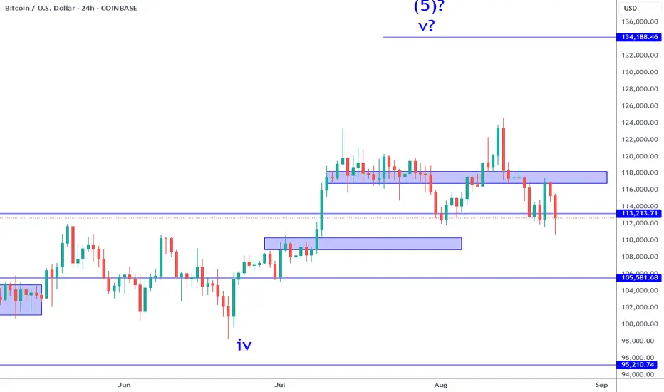 Bitcoin has just established a lower high in the 117K area. While this is a bearish sign for intraday time frames, the broader structure has yet to confirm a change. The change I am looking for is the price overlap of the 108K area. The 112 to 113 support area while some what broken, has not followed through yet. IF price stays in this range and manages to say above 108K, then this can still qualify as a wave 4. IF 108K breaks, then this confirms that the 5 wave structure is likely complete. If that's that case, the bigger picture outlook becomes more bearish.