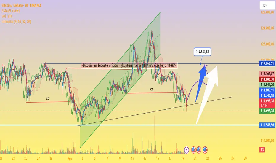 Rialzista (frecce blu/bianche): Se BTC mantiene sopra i 114.000 $ e rompe i 115.500 $, potrebbe salire verso 119.500 $+.