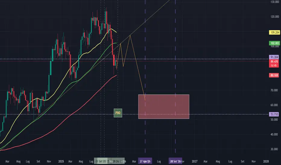 Dando per partito ITM su BTC, senza ovviamente sottovalutare la possibilità di un ulteriore affondo, essendo nella classica geometria di connessione (connessione non ammissibile mi sembra dai puristi dell'analisi ciclica dei minimi e dei massimi - ma per me elemento fondamentale della ciclicità geometrica (una nuova geometria richiese SEMPRE una connessione per invertire il ritmo ciclico dei massimi e dei minimi) in cui nuovi minimi sono ammessi (in particolare nella barra 4 o barra 5 su weekly dopo minimo geometrico, mi aspetto un retest della direttrice principale del ciclo precedente. Successivamente intorno ad Aprile avvicinarci al livello secondo me target di questo movimento, quel P80 menzionato nell'idea precedente