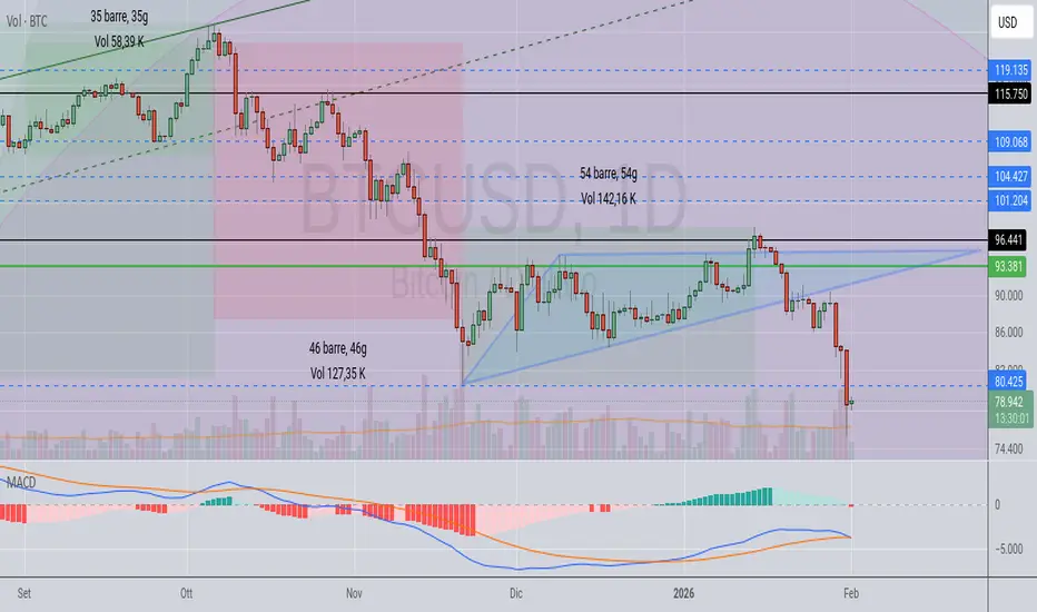 Buongiorno a tutti. Oggi prendo atto di quello che avevo visto, ma non volevo vedere. La triangolazione è stata validata verso il basso, dopo un finto break al rialzo. Il mio errore è stato sottovalutare questo pattern, nonostante sapessi che il trend rialzista fosse in esaurimento della sua forza, ho sperato in un test dei 104/108k usd, per vendere più alto possibile e magari fare anche qualche trade veloce. Invece il mercato mi ha dimostrato che non posso usarlo a mio piacimento, avrei avuto più beneficio a prendere atto del break in basso con la conferma sulle 84k usd. Ecco dove ho sbagliato, per il resto il mio scenario di riferimento si è manifestato in tutto il suo orrore, btc che va in bear dopo un bull market anemico. Spero che almeno le alts non schiantino male, ma l'andazzo non è dei migliori, farò bene a prendere atto da subito di ciò che vedo sul grafico.