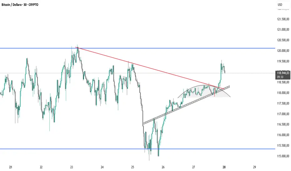 Questo grafico a 30 minuti di Bitcoin (BTC/USD) mostra una recente rottura al di sopra di una trendline discendente (rossa) e un pattern a cuneo ascendente. Il prezzo ha rotto una struttura arrotondata, indicando una potenziale inversione rialzista. La candela di rottura è forte, suggerendo un momentum rialzista. La resistenza chiave si trova vicino a 120.000 (linea orizzontale blu), mentre il supporto è intorno a 115.600. Attendere la conferma della rottura con volume o un nuovo test del livello di rottura per un movimento rialzista sostenuto.