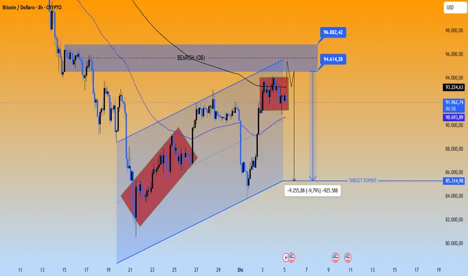 Il grafico mostra un setup ribassista da un order block di timeframe alto con una chiara proiezione verso il basso. Tutte le strategie—SMC, price action, trading sul canale e concetti di liquidità—indicano una possibile discesa verso 85.3k se la struttura del box rosso viene rotta.