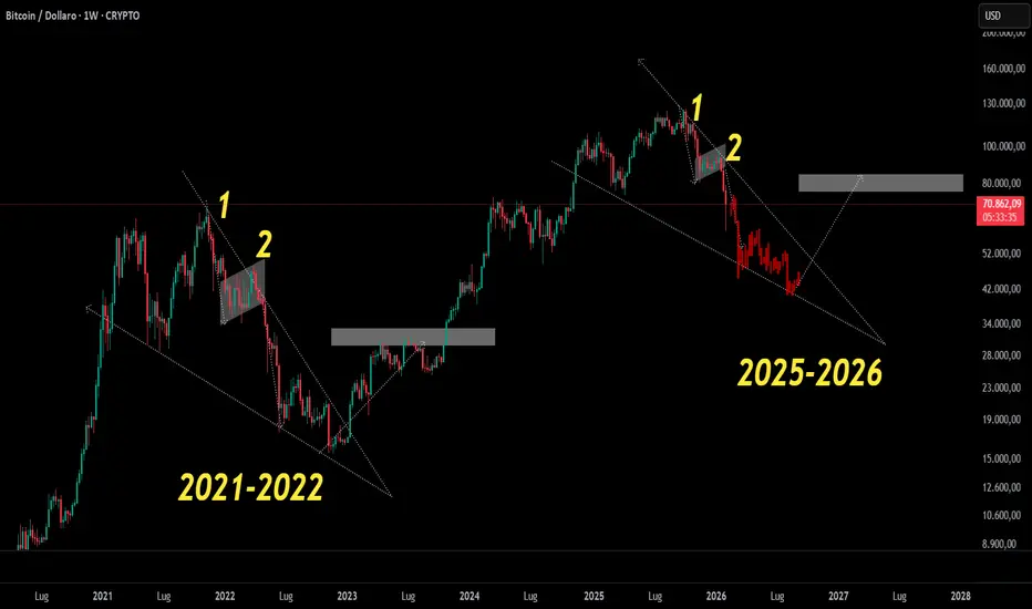 Bitcoin sta per fare un’altra gamba verso la fase di piena capitolazione. Nel 2021, Bitcoin ha iniziato a diminuire e le gocce seguivano un modello di bandiera arbugiana. Avevamo raggiunto la fase di capitolazione. Tutti pensavano che il gap dei prezzi sarebbe stato colmato rapidamente, ma avevamo un’altra piccola gamba giù, e poi completato il modello a cuneo cadente. Questo è stato un modello di inversione, dopo di che Bitcoin ha attaccato il gap dei prezzi e pompato. Lo stesso scenario si sta verificando ancora una volta. Tutti pensano che questa sia la fine del declino, ma si sbagliano. Possiamo ancora muoverci verso la fase di capitolazione completa. Condividi i tuoi pensieri. Grazie a te. Buona fortuna.