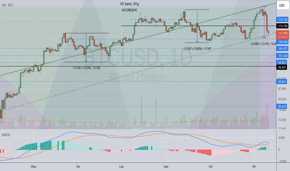 Non è questa l'analisi in cui parlarne, questa è solo una dimostrazione come due trendline tengono fermo il prezzo in un range ben definito. La trendline superiore ora fa da resistenza e quella sotto da supporto, scontato vero? Be' no, perché in questi giorni ho letto molta gente che era sicura di vedere btc a 150k o su ancora, io avevo un TP a 137k usd, ma pazienza, nel caso facesse qualche scherzone come quello di ieri, guadagnerò meno, però la debolezza dimostrata in questi mesi da parte del prezzo, aveva un'importanza strategica. Osserviamo le correzioni precedenti, tutti distribuite in periodi di breve, una di 30 e l'altra di 20 giorni circa, -12% e -13%, mentre l'ultimo movimento in 3/4 giorni il prezzo è sceso del 13%. Osserviamo il macd sotto, che questo massimo storico ha manifestato una divergenza tra prezzo e indicatore(configurato su periodo intermedio), avendo questi dati, voi comprereste adesso?