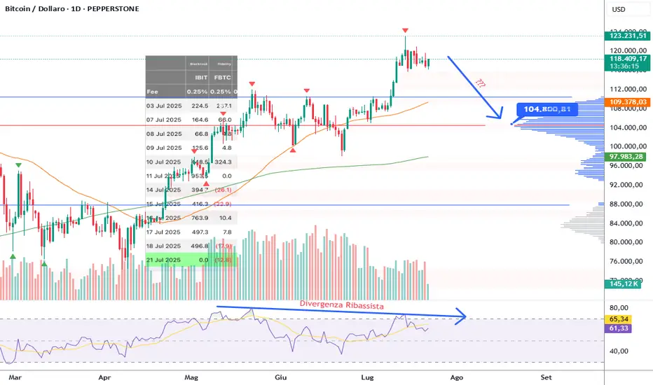 Anche se il prezzo ha registrato nuovi massimi recenti, c’è una cosa che potrebbe interferire con ulteriori rialzi: il prezzo attuale è in divergenza ribassista con l’RSI. Infatti come potete notare c’è una tendenza di massimi decrescenti sull’oscillatore che potrebbe richiamare dei movimenti di correzione ( il poc a 105k???? ).