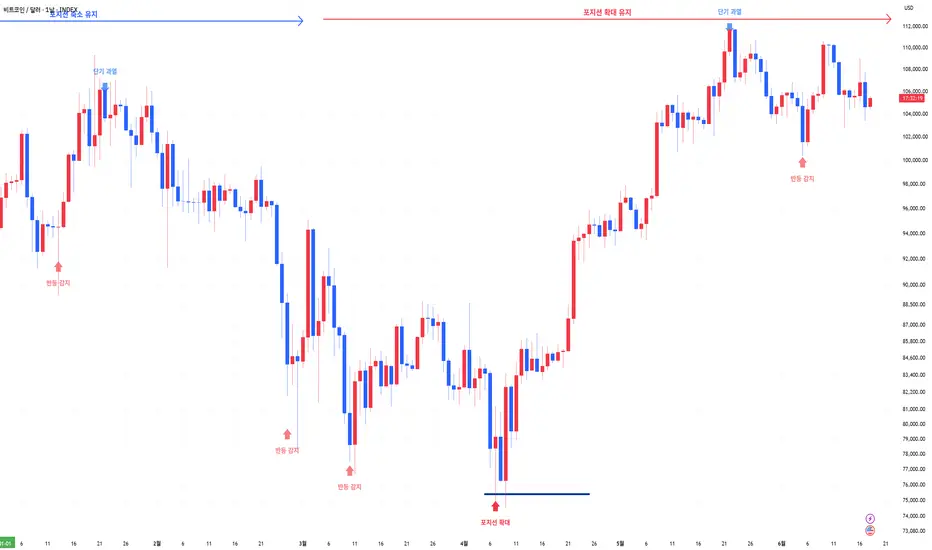 * 미국 지수는 4월에 포지션 확대 시그널이 발생하였고 동일하게 비트코인에도 적용이 된다.