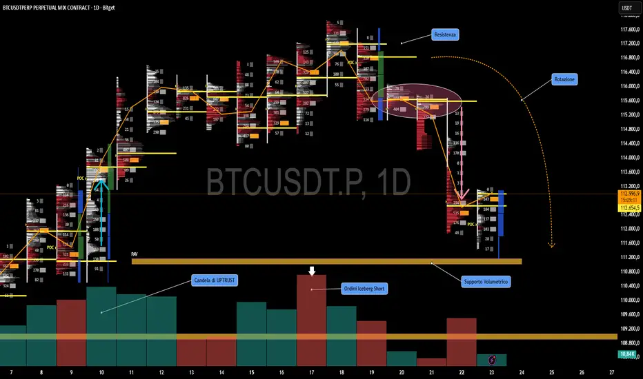 L'analisi Volumetrica del grafico BTCUSD - Settimana post Tagli FED , evidenzia come il sell off verificatosi Domenica 20 in realta' è stato chiamato gia con la candela Short del mercoledi precedente , che ha trovato conferma sulla resistenza volumetrica del POC poco sotto i 118k come indicato a grafico .