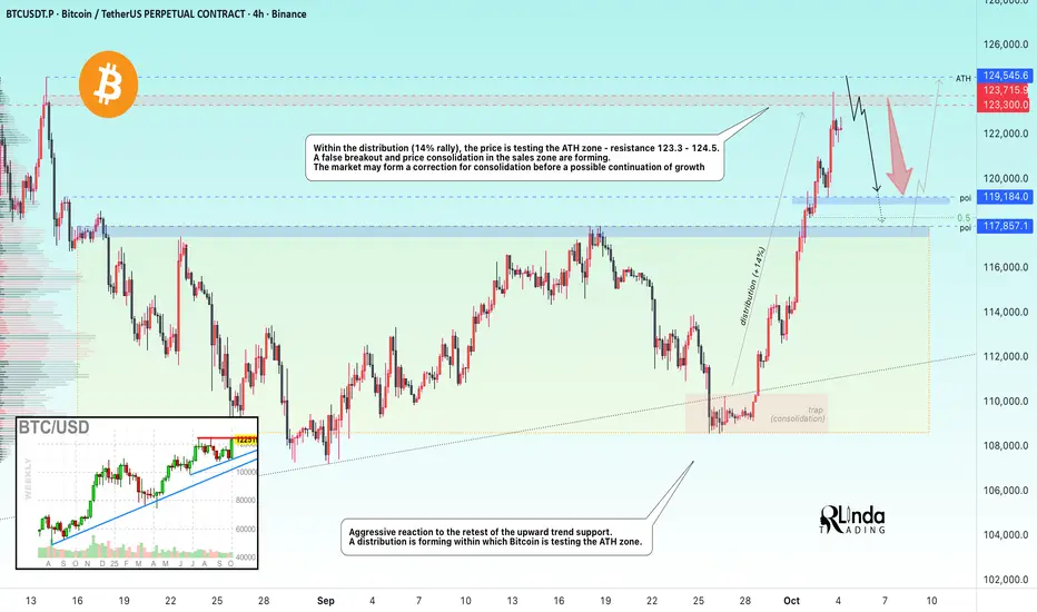 The price is reacting aggressively to the retest of the uptrend support. A rally is forming, and Bitcoin is testing the ATH zone. As part of the distribution (14% rally), the price reaches an important resistance zone, behind which lies a liquidity pool - 123.3K - 124.5K. However, the growth ends with a false breakout and subsequent price consolidation in the sales zone. To break through such a strong zone, the market needs significant consolidation, which is currently lacking, and the news that caused the price to grow so strongly has already partially exhausted its potential. Thus, the market may move into consolidation, correction to accumulate potential, or wait for the next bullish driver.