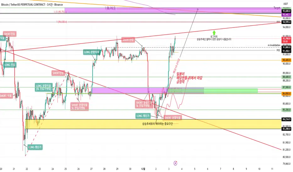이 상승추세가 이어진다면 녹색박스에서 지지를 받고 상승을 이어준다면 이번 단기 상승 추세의 C파 마무리자리 96.2K 까지 상승이 나올겁니다